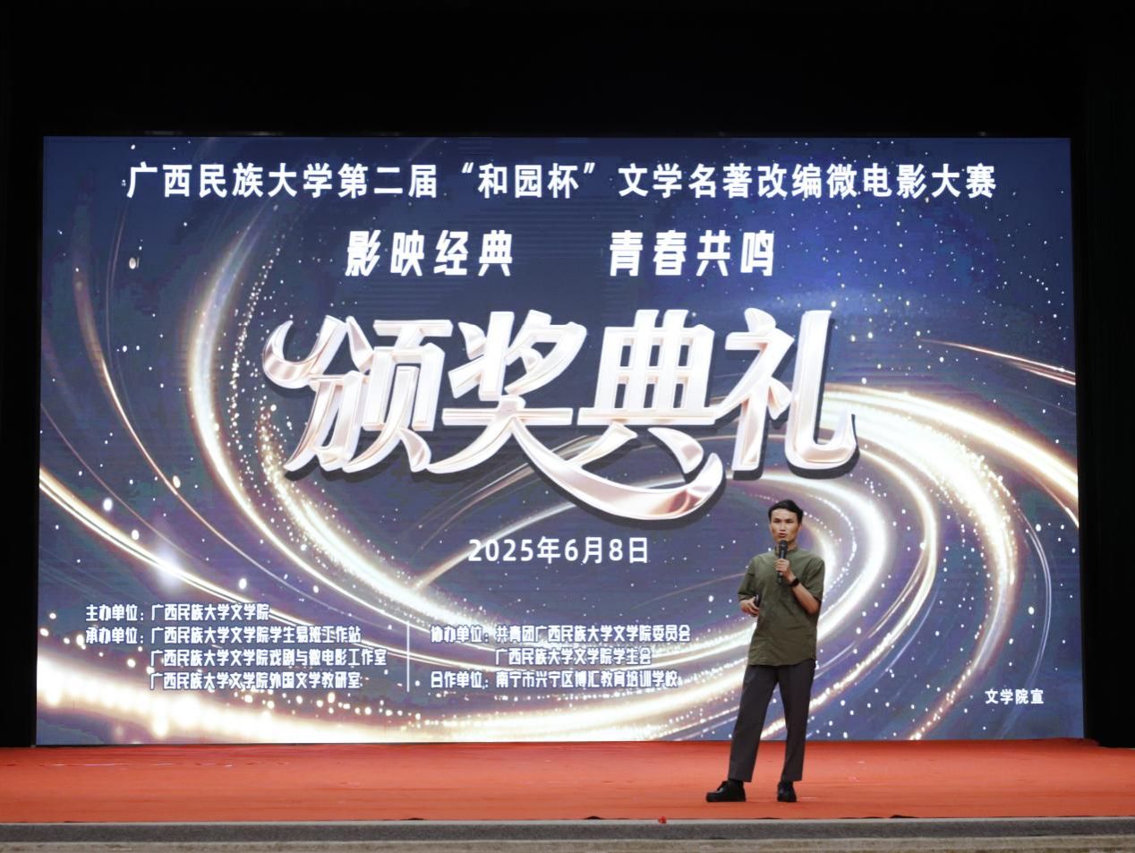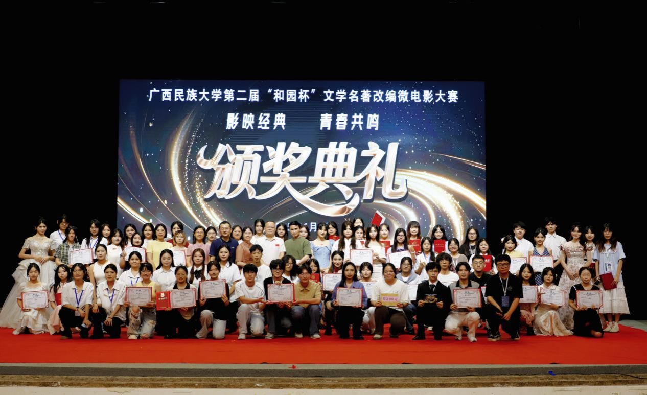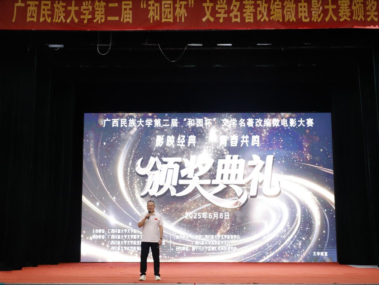 6月8日晚,伟德国际1949始于英国第二届“和园杯”文学名著改编微电影大赛颁奖典礼在相思湖校区大礼堂举行。公司党委副书记吴先源,传媒公司副经理万益杰,伟德国际1949汉语言文学系主任李惠玲,伟德国际1949外国文学教研室李忠敏、蔡勇庆、唐子尊,广西千年传说影视传媒股份有限公司编剧韦晗依,南宁市兴宁区博汇教育培训机构副董事长周欣等嘉宾出席典礼并为获奖者颁奖。
