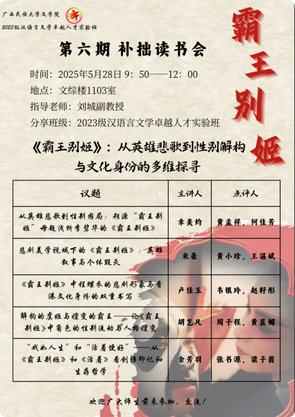 5月28日上午伟德国际1949第六期“补拙读书会”在文综楼1103举行,本次读书会由2023级汉语言文学卓越人才实验班承办,刘城副教授担任指导老师,主题为“《霸王别姬》:从英雄悲歌到性别解构与文化身份的多维探寻”。