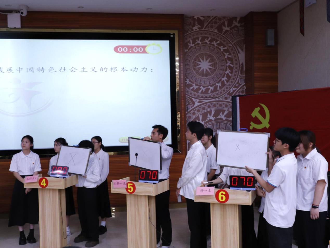 “狭路相逢”环节的题目涵盖党章、党的二十大报告、党的二十届三中全会精神等内容。各参赛队伍全神贯注,认真思考,迅速作答。本科员工第四党支部、研究生第二党支部、研究生第五党支部三支同分队伍进入附加赛。参赛选手用抢答的方式进行比赛,更高积分者晋级下一环节。研究生第二党支部成功赢得晋级机会。